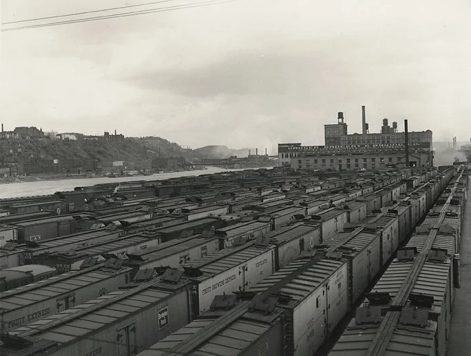 Carloads of fruit and vegetables at terminal, Pittsburgh, Pa., 1941. Vintage gelatin silver print. Vachon’s Farm Security Administration credit stamp on back. Image measures 7 3/16 x 9 1/2 inches. Inventory #C1711 Terms | Inquire